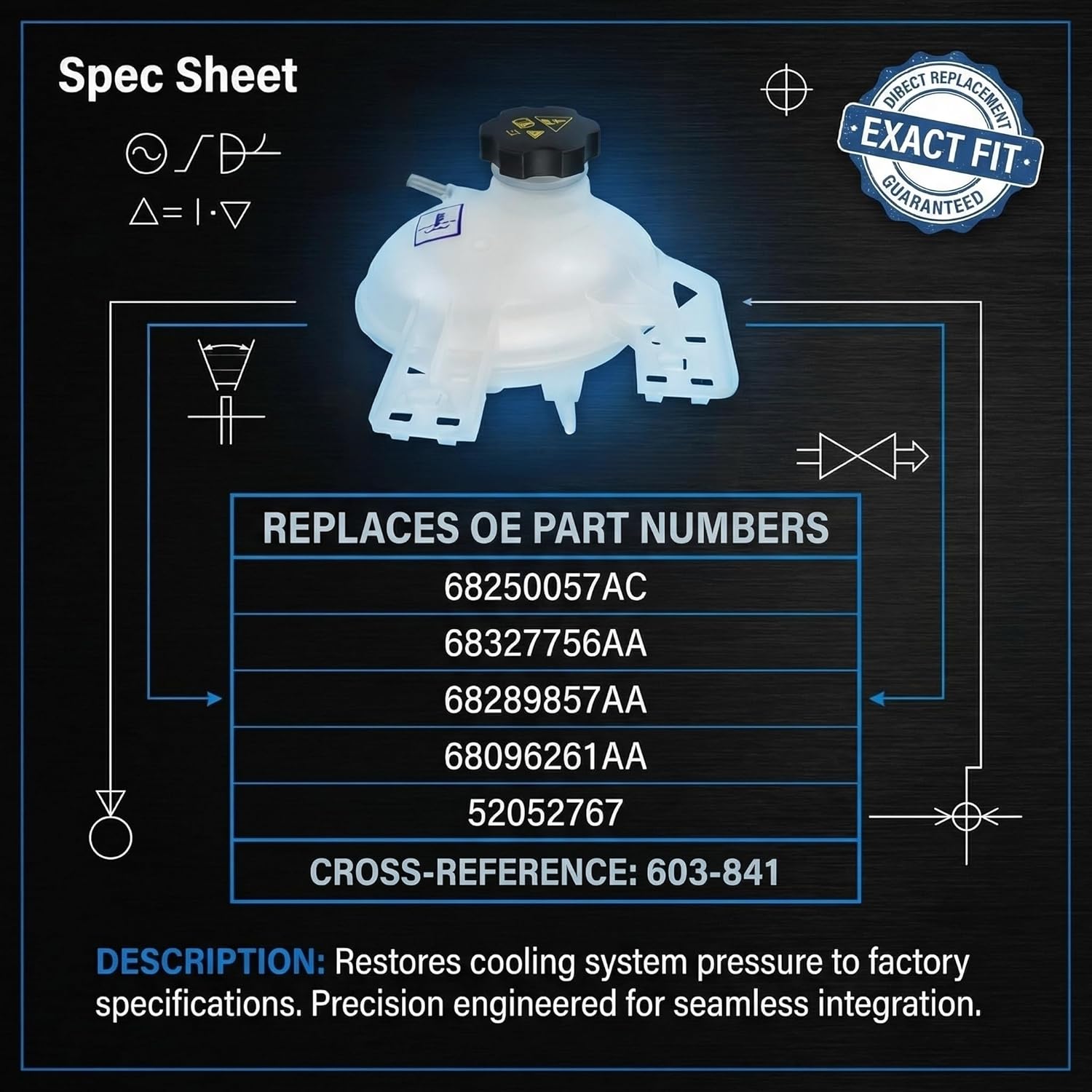 | OEM Equivalent Part Number | 603-841, 68096261AA, 68327756AA, 68289857AA, 68303699AA, 68248083AA, 68249136AA, 68442532AA, 68250057AC, CH3014170, 68289857AAPFM, 52052767 |