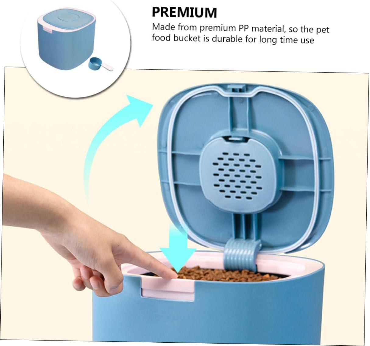 Package Include 1 x food bucket Features -Material: PP -Color: Blue -Size(11L): About 28.00X25.00X23.50cm/11.00X9.82X9.24inch -Product Info:Grain storage barrel -Durable and solid material is well made, fall resistance and a strong bearing capacity. -With large storage capacity, it can help you store large quantity of pet food one time Storage Case for Pet Food. -The whole appearance design of product is simple and generous for your daily use Storage Bucket. -The perfect gift for family and friends who , they will like it very much Dog Food Storage Bin. -Keep dry dog food or cat food in this airtight food storage container, which is very practical Container for Pet Food.Goods InformationPet Food Storage Container Do you have a lovely pet cat or dog? Do you wanna a pet food storage bucket? If your answer is yes, then your search is over.Household Cat Food Container Our product will be a wise choice.Pet Food Container Adoption of sturdy PP materials, reliable and not easy to break