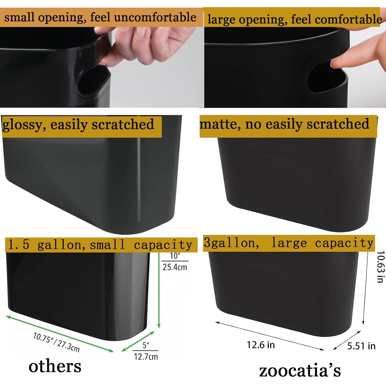 Small Plastic Trash Can SpecificationsProduct Dimensions:12.6 L× 5.51 W × 10.63 H inches(manual measurement, there may be small errors)Item Weight: 0.73lbPackage: bathroom trash can with handles × 1PackMaterial: BPA-Free pp plasticColor : Black Shape: Slim Oval shapeTwo-Way Durable and Smooth HandlesThe two-way handles are durable, large and feels smooth and comfortable, it won't scratch your hands.Rainbow DesignThe rainbow design of the two sides of trash can is beautiful and full of vitality, it's the best decoration in your home.Matt Trash Can for BedroomBe different from other glossy trash can, our matt wastebasket for bathroom is not easy to be scratched, designed for long lasting organization.Multiple Colors The colors are simple and stylish, and seven colors are available, so you can choose the color that you like How To Clean?It is easy to clean, you can wape it with a dampe cloth.